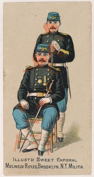 Editor: This small print from 1881, titled "Forage Cap, Infantry, United States," by Abdul Cigarettes, showcases a Union soldier. The uniform's rendering feels stiff, almost like a doll. What do you see in this piece? Curator: The serialization of military uniforms in commercial prints reduces the individual to a symbol, a component of a larger, idealized whole. Note how the colour palette is constrained, dominated by blues, creams, and reds that flatten the image. Consider also the precise, linear quality of the printmaking, which disallows any expressive freedom. Editor: I see what you mean. It’s less about the individual soldier and more about presenting the uniform as an object, right? It reminds me of a fashion plate, almost. Is the abstraction intentional? Curator: Indeed. The print operates on a system of representation where the uniform signifies “Infantry, United States” rather than embodying lived experience. Notice, too, the use of the underpainting which enhances the formal aesthetic through varied applications to colour and texture. This, as distinct from experience, becomes its primary subject. Editor: So the focus is not on realism but on communicating an idea of military identity through formalized elements. Curator: Precisely. By decoding the stylistic decisions, one might further analyze its conceptual stance— the transformation of the military body into a standardized image for mass consumption and even an aspiration. Editor: Interesting, I never would have looked at a cigarette card that way. Thank you! Curator: My pleasure, such close observation gives the aesthetic space and structural devices in the work more interpretive space for further exploration.