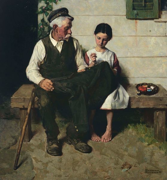 Hans Andersen Brendekilde painted this domestic scene, "Two Girls with Needle-work Sitting in a Farm Yard," in the late 19th or early 20th century, capturing a slice of rural life. Brendekilde, who came from a humble background, often depicted the lives of peasants and the working class, imbuing his work with both social realism and sentimentality. Here, we see two young girls engaged in needlework, a common activity for women, reflecting their expected roles in society. Their concentration and the intimate setting suggest a shared world of labor and companionship. The act of needlework itself, traditionally a domestic skill, becomes a focal point. It speaks to the gendered expectations and the economic realities of the time. Brendekilde’s choice to portray these girls with such care invites us to reflect on the lives of ordinary people and the dignity of their daily work, while prompting questions about the limited opportunities afforded to women in rural communities.