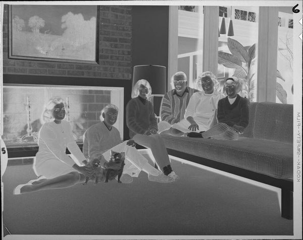 Editor: This photograph, “Untitled (people drinking cocktails, man on telephone)” by Lucian and Mary Brown, presents a scene frozen in time. With everyone dressed in formal attire, what symbols do you see playing out here? Curator: Well, the cocktail itself is a powerful signifier, linking to ideas of leisure, social ritual, and even a certain level of sophistication. It speaks to a specific cultural moment, perhaps a yearning for normalcy. Editor: Normality? Curator: Yes, consider the man on the telephone, a symbol of connection but also of distance. The act of drinking and the act of communicating, both attempting to bridge gaps. How do they speak to our present moment? Editor: I never considered the telephone as a symbol of distance! It's interesting how these symbols evolve over time. Curator: Indeed, and how our interpretation of them changes too.