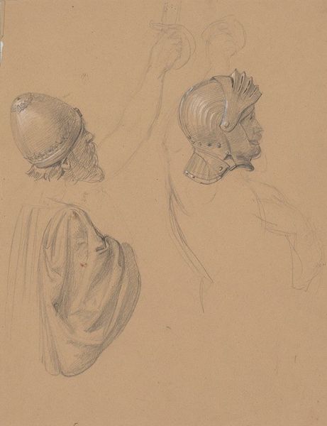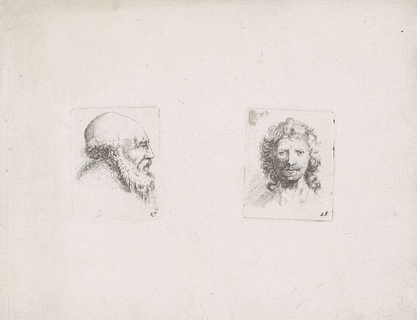Curator: Wenceslaus Hollar's "Two Male Busts in Profile to the Left", created sometime between 1620 and 1664, is a rather understated engraving. The work features two portraits of men facing left, each confined within a rectangular border. Editor: It has an antique quality to it. I am struck by the difference in the rendering of the headdresses—the contrast feels intentional and a little discordant. Curator: Hollar's use of line and tone, particularly the shadows cast by the drapery around the figure's heads, infuses this modest image with a surprisingly theatrical mood. The man on the right appears to be styled to evoke a classical image, maybe even biblical. Editor: Note the hat, or rather, turban-like headwear of the rightmost man—the draped effect adds an air of gravitas, perhaps alluding to scholarship or even prophecy, but it looks different, more precise. Is there some tension between historical periods being alluded to here, Baroque classicism perhaps bumping against an evocation of the Early Renaissance? Curator: The head covering can mean a lot of things depending on context; during the 17th century, portraiture like this often adopted foreign elements in costumes to display knowledge or perhaps interest. Editor: That feels right, in terms of an explanation for the artist's technique. There's a contrast in their apparent identities; one appears quite regal, almost courtly, while the other seems more learned or of religious importance, an educated figure rather than just the display of status. The differences create a subtle narrative tension. Curator: A tension built, quite skillfully, through visual choices, yes! This modest engraving is not just a portrait; it is a nuanced reflection on identity, aspiration, and the role of representation in the early modern era. Editor: It invites us to consider how fashion and symbolic weight merge to create powerful visual statements, so much conveyed with so little visible space. I am always amazed that portraiture can express the inner character in an exterior likeness.