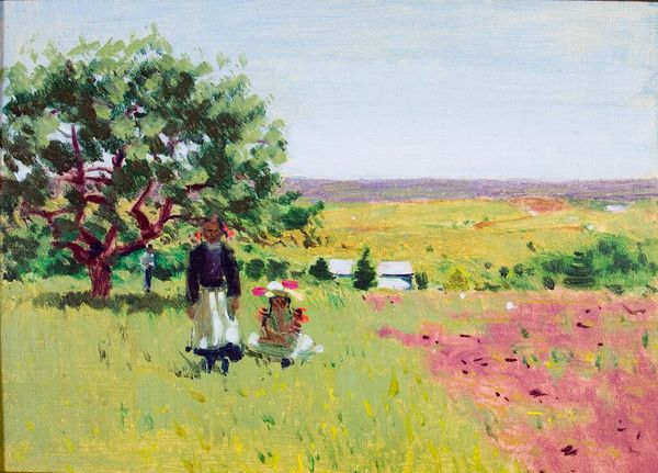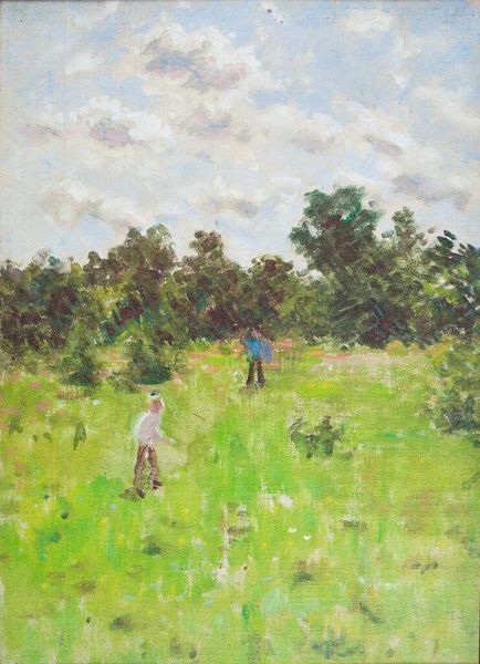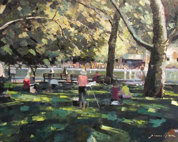 Editor: So, this oil painting, entitled "Wet Paint" by Jeff Jamison, depicts a group of artists working en plein air. I’m immediately struck by the vibrancy of the greens and the way the impasto technique makes the whole scene feel so alive, like you could almost step right into the painting. What captures your attention when you look at this piece? Curator: Ah, what a delightful image! I find myself drawn to the narrative element – a cluster of artists creating art, becoming, in a way, the subject of another artist's gaze. It's like a mirror reflecting back on the creative process itself. What do you think Jamison might be saying about the act of observation? Editor: That's an interesting point. Perhaps it's about capturing a fleeting moment of artistic community, the shared experience of trying to interpret the landscape? Or maybe the layers of representation suggest the subjective nature of seeing? Curator: Precisely! And consider the 'wet paint' – is it just a literal descriptor, or a sly commentary on the unfinished, the always evolving nature of both the artwork and the scene it represents? It’s like he’s playfully inviting us to participate in the ongoing creative dialogue. Do you feel invited? Editor: I do! The brushstrokes are so loose and expressive that I almost feel like I could pick up a brush and add my own interpretation. It definitely emphasizes the idea that art is never truly finished. Curator: And that’s the joy of it, isn’t it? Jamison has created not just an image, but an invitation—a playful prompting to dive into the messy, beautiful process of seeing and creating. Editor: I never thought of it that way before! This has given me a whole new perspective on what it means to capture a scene, not just replicate it. Thanks!