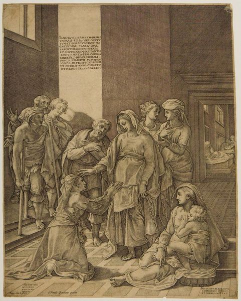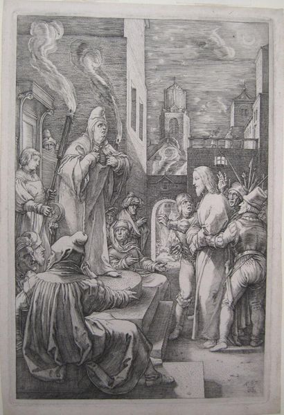 Curator: This etching, "Jacob Telling his Dreams," made by Rembrandt van Rijn around 1638, is so captivating in its miniature scale. What catches your eye first? Editor: The sheer density of it all! The cross-hatching to create shadows is quite something, isn’t it? So much dark ink applied to paper to build up drama… it almost feels claustrophobic. Curator: Yes, the way Rembrandt manipulates light and shadow even within such a small space amplifies the tension in this family dynamic. The etching technique lends itself so well to creating these nuanced emotional textures. Do you get a sense of skepticism in the observing crowd? Editor: Absolutely. You can almost feel the economic anxieties swirling amongst the siblings surrounding Jacob; it seems their reactions are so tied to questions of succession. Rembrandt's masterful ability to convey these themes using humble materials is pretty undeniable. What exactly was the printing process involved? Curator: Rembrandt expertly used etching: acid would eat into a metal plate according to lines the artist drew in wax, allowing for those lines to then be filled with ink and transferred onto the paper. Thinking about this image reproduced from a matrix really gets you considering how accessible this story became thanks to the printing press. Do you think Rembrandt was conscious of this shift? Editor: Surely, and his exploitation of the medium proves this. Consider the time involved: grinding pigments, preparing the copper plate, the application of grounds. The consumption involved in such printing runs is substantial, both for Rembrandt himself and the communities in which these etchings circulated! Beyond artistry, he’s embedded labor itself within each work. The dreams here carry a weight far beyond religious meaning. Curator: It’s a marvelous intersection of art and economy, with faith flickering somewhere underneath it all! When I look closely, I sense the dream is more of a shared burden, or perhaps a test for both father and sons… And it is lovely how he captures intimate emotional truths with very rudimentary tools. Editor: Right! I now realize that for every visionary, there's the paper maker, the metalworker and countless others contributing their hands and resources! Thinking about the social impact woven in these details offers so many interesting insights. Curator: It enriches how we perceive everything; the mundane is part of something much larger!