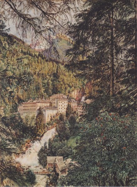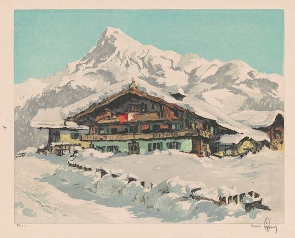 This is 'Gezicht op een berglandschap te Canazei, met op de voorgrond een gebouw', a landscape image by Hans Hildenbrand. It’s a view of a mountain landscape, probably captured with photography and then hand painted. What strikes me about this piece is the way Hildenbrand captures the crispness of the mountain air. Look at the building in the foreground. The meticulous rendering of the architecture is juxtaposed with the soft, almost hazy treatment of the distant mountains. The color palette is muted, dominated by greens, grays, and whites, creating a sense of tranquility and stillness. Hildenbrand might remind me of someone like Gerhard Richter, in his landscapes, who also blurred the lines between photography and painting, and questioned the nature of representation. Ultimately, this piece is more than just a pretty picture. It's an invitation to slow down, breathe, and contemplate the beauty of the natural world.