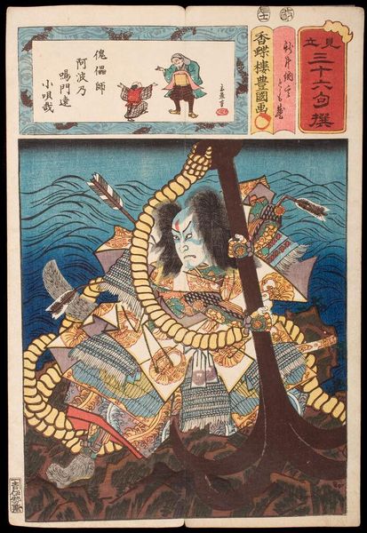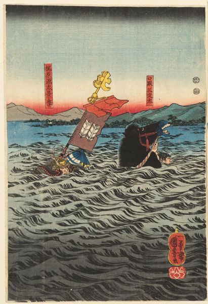 Editor: This is Utagawa Kuniyoshi’s woodblock print, "The Battle of the Uji River." I'm struck by the dynamic movement and the contrast between the detailed figures and the stylized waves. What can you tell me about it? Curator: Notice the materials used. Kuniyoshi employed woodblocks, a technique deeply rooted in Japanese craft traditions. The labor-intensive process highlights the contrast between mass production and artistic skill. How does this impact your understanding of the depicted battle? Editor: It makes me think about the commercial aspect, that this dramatic scene would be reproduced. Curator: Exactly. And consider the social context: How does this artwork reflect the values and the consumption of art during its time? Editor: It shows me that art wasn't just for the elite, it was made for everyone. Thanks! Curator: Indeed, a convergence of artistic expression and material culture.