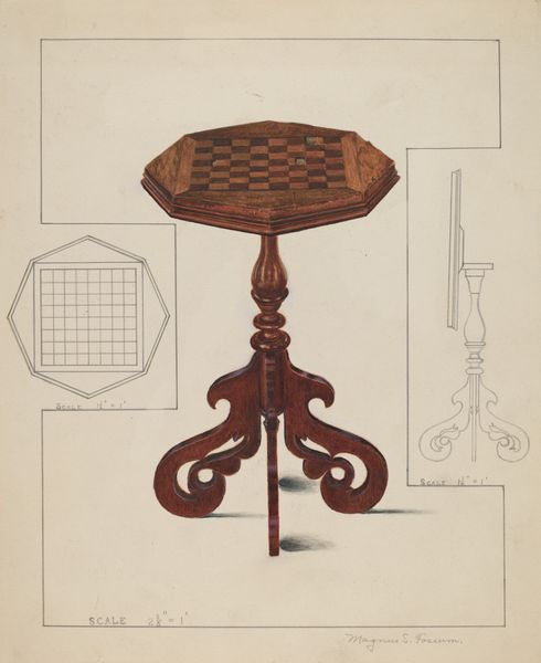 Curator: This is an etching and pencil drawing from the first half of the 19th century entitled, "Design for a Star-shaped Tilting Pedestal Table: Two Views," created by an anonymous artist. It resides here at The Met. Editor: Striking! The precision is almost unsettling. Look at those flawless lines. It’s a star, but also intensely geometric and regulated. It hints at suppressed dynamism—a table aspiring to flight! Curator: Exactly. The star shape is paramount, as is its perfect division. Notice the convergence of lines at the central point. The artist emphasizes structure—we’re presented with an almost diagrammatic dissection of form, viewed from two different perspectives to showcase the tilt. Editor: Yet, beyond the geometric idealism, one wonders about the labor invested here. Imagine the craftsmanship to realize this table in wood or metal, translating the designer’s concept into something tangible and useful. It is all about a design eventually executed in someone's work shop! Curator: Absolutely, the realization would require specific craft. However, consider the semiotic weight of the star itself. The artist consciously invokes symbolism through shape, suggesting aspiration, perhaps a connection to enlightenment ideals that permeated that era of design. The star's geometry offers formal harmony. Editor: True, and beyond ideals, one can wonder: what would they have used this table for? How accessible or exclusive would an item like this have been based on labor involved? It feels pertinent to recognize that this design embodies both luxury and daily domestic interactions of a time, depending who used such tables. Curator: Those are excellent considerations, revealing how we often view designs in a contextual vacuum. It’s fascinating to consider both the form and intended functionality within societal dynamics. Editor: It does indeed bridge what is seen and unseen – a true dance of idea and reality in its core. Thanks for shining light to this stellar artifact. Curator: And to you! Thank you for highlighting a perspective centered around production; a helpful angle.