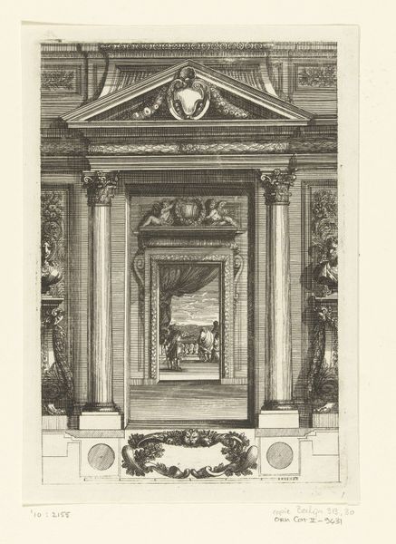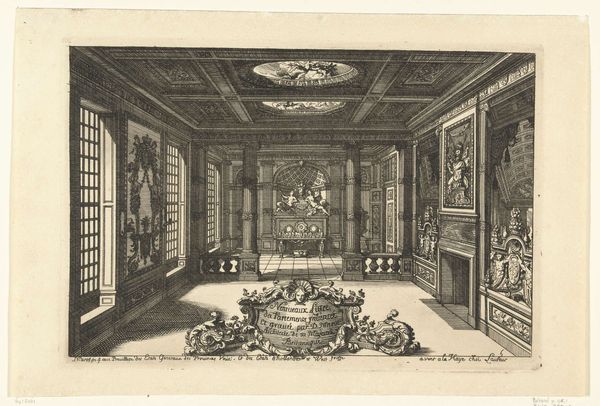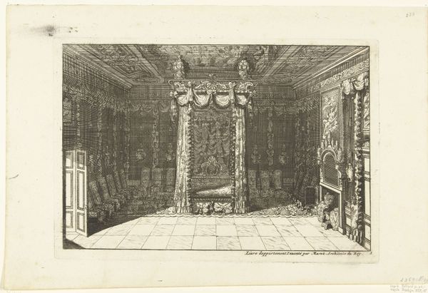This engraving presents an interior with a canopied bed and a chimney, its provenance unknown. The canopied bed, or "lit de parade," was a potent symbol of status and authority. It served not only as a place of rest, but also as a stage for the rituals of courtly life. The arrangement of chairs along the walls, facing inward, invites us to consider the dynamics of power and presence within this room. This arrangement echoes the seating arrangements found in ancient Roman senates, a motif later revived during the Renaissance, suggesting a lineage of authority. The bed, with its elaborate canopy, becomes a throne-like emblem. Consider how such a symbol transcends its immediate context. The motif of the canopied space recurs throughout history, from religious canopies to royal baldachins. In each instance, it marks a space of reverence, a point of convergence where power, faith, and the human psyche intersect. Like a recurring dream, this motif resurfaces, bearing the weight of history while adapting to new cultural landscapes.