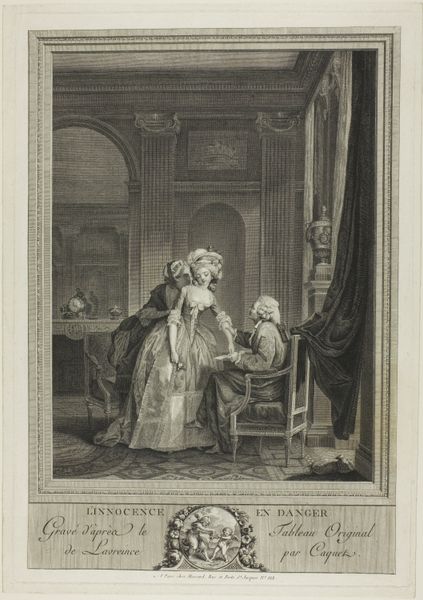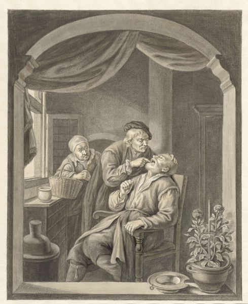 Curator: I find this little watercolor so darkly amusing! “The Dentist,” by Willem Joseph Laquy, is ostensibly a genre scene, but look closer… it's all quite peculiar, wouldn't you say? Editor: My immediate reaction is a visual shudder. It’s the awkward angle of the patient's body, the almost cruel intensity of the dentist. The muted colors amplify the feeling of grim, quiet desperation. It speaks to the universal dread of…dental work. Curator: Exactly! Laquy gives us so much in this drawing, dated sometime between 1748 and 1798. Observe the collection of apothecary jars in the background, the almost operatic stage created by those arches… it feels less like a mundane tooth extraction, and more like a performance. The hammock strung across the top just adds to the theatre. Editor: Yes, there's definitely a staged quality. That suspended… is that an alligator, perhaps? What does it symbolize, hanging ominously above the poor patient? Is it meant to foreshadow some lurking danger or represent a raw, untamed part of our physical existence? The jaws, of course, resonate with the scene below. Curator: Perhaps. And what about that little boy grinding something in the corner, totally engrossed? Is he making some sort of medicine, or maybe preparing something altogether more sinister? Then there's the woman with the basket; she’s there as some silent, concerned guardian angel! Laquy delights in unsettling contrasts. Editor: The contrast also shows in how light is captured: softly illuminating parts of the scene but then leaving much to dark, undefined regions. The Rococo sensibility favored delicate ornamentation, which you do see in small details in the clothing or shelf decorations, but that play of light is far from superficial. The symbols might just show an uneasy tension of enlightenment ideals versus harsh realities of human experience at that time. Curator: Precisely! Laquy is brilliant because he layers satire within apparent realism. It's a little watercolor full of sharp commentary! A snapshot of discomfort rendered with sublime skill and knowing wit. Editor: Absolutely. Even within what appears a straightforward illustration, there is complex story being suggested about pain, care, spectacle, and symbolic darkness, reminding us how layered the simplest scenes are if you only care to pay attention.