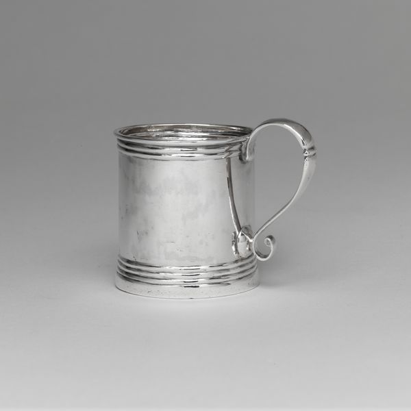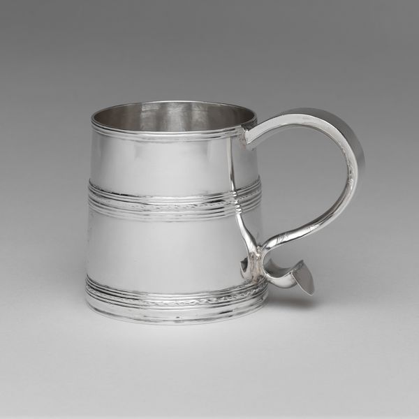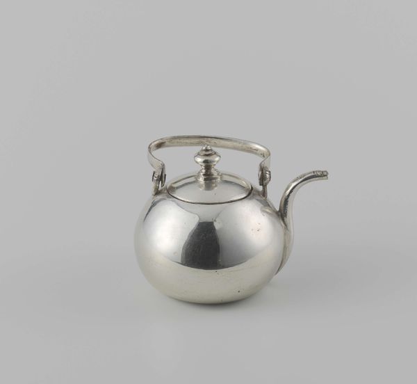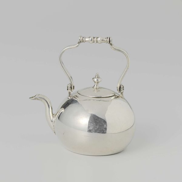 Editor: We're looking at a "Waterpot," crafted around 1725 by Frederik van (I) Strant, worked in silver. The piece gives an immediate impression of simplicity despite its material. How might we interpret its visual language? Curator: Initially, consider the pot's form. Note the sphere-like body counteracted by the distinct, almost rigid, circular lip. Do you perceive a tension in that juxtaposition? Editor: I do, now that you point it out! It feels like a negotiation between organic and geometric shapes, softened by the hammered texture of the handle. Is there a name for that visual tension? Curator: We could term it "dynamic asymmetry," perhaps, as the handle’s placement creates an imbalance resolved by the eye's movement around the object. And observe how light interacts with the silver surface, creating gradients that define its volume. This piece demonstrates a strong comprehension of light and form. Note too the plainness of its form which forces our attention onto the beauty of the hammered silver. Editor: That makes sense. The simplicity really amplifies the material quality. But I am now curious, do you find any philosophical connections in the formal elements? Curator: Consider the unadorned form reflecting the self. Silver mirrors and retains images. Its formal construction invites us to examine it – and by extension, ourselves, without the noise of figuration. The Baroque may celebrate opulence but note this restrained version. Editor: Fascinating, I didn't consider the reflective aspect on that level. Looking at the craftsmanship and how light plays on the surface truly unlocks a deeper perspective on the object. Thank you! Curator: A close examination always yields a fresh appreciation of the artwork, especially when its intrinsic components are brought to light.