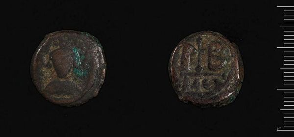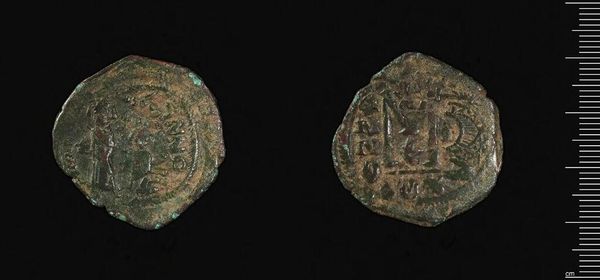 Editor: Here we have a coin of Phokas, weighing 9.84 grams, over at the Harvard Art Museums. It looks pretty worn, but you can still see figures. What do you see in this piece, from a materialist perspective? Curator: It's fascinating to consider this coin not just for its imagery, but as a product of labor and material extraction. Where did the metal come from? Who mined it, refined it, and then physically struck these coins? This small object represents a complex network of production and consumption. Editor: So, you're less focused on who Phokas was and more on the people who made the coin that bears his image? Curator: Precisely. The value isn't inherent but assigned, based on material scarcity, labor investment, and the authority it represents. Considering the coin as a commodity reveals the economic structures of the time. Editor: That’s an interesting way to think about it. I never considered all the hands involved. Curator: Indeed. It grounds the narrative in the realities of the people who made the empire function.