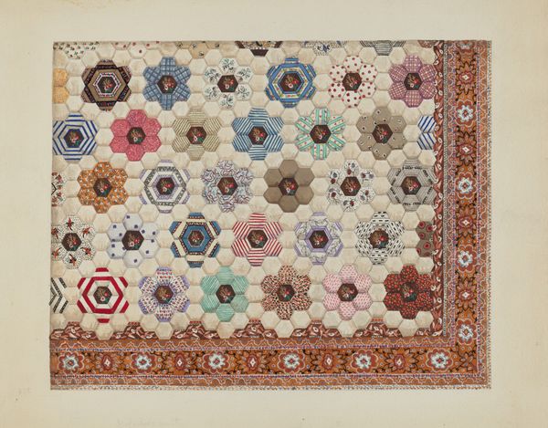 Editor: This is Esq Tom Phillips's "A Grammar of Ornament," held in the Tate Collections. It looks like a patchwork quilt contained within a playing card. What do you see in this piece? Curator: The quilt as an icon is interesting. It evokes domesticity, comfort, and the feminine, but enclosed by the rigid structure of the playing card, those associations become destabilized. Editor: So, the familiarity is disrupted by the frame? Curator: Precisely. Consider the ornamental border and corners of the card – do they mimic or mock traditional notions of beauty? How does the juxtaposition alter the cultural memory associated with each? Editor: It’s like Phillips is asking us to re-examine our assumptions about both the high and low arts. Curator: Yes, it also makes you think about the symbolic weight everyday objects and images carry.