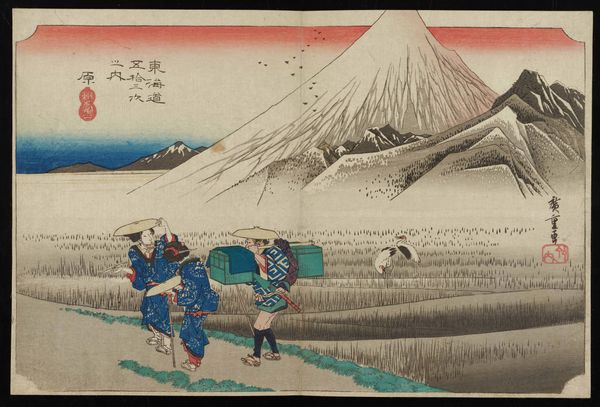 Curator: What strikes me immediately about this print is the sheer flatness of the landscape, juxtaposed with the iconic, looming presence of Mount Fuji in the distance. The restrained palette adds to the tranquil feeling. Editor: You've zeroed in on precisely what makes this woodblock print, "Act VIII" by Utagawa Hiroshige so captivating. It dates from around 1843 to 1847, and what you're seeing here is a masterful example of ukiyo-e, the art of woodblock printing that thrived in Japan's Edo period. Prints like this, capturing scenes of daily life and famous landscapes, were not simply aesthetic objects. They served as powerful visual narratives circulating amongst a burgeoning merchant class with access to the arts. Curator: Absolutely. You can see this democratization of art through the way Hiroshige depicts the travelers – ordinary people with burdens, each lost in his or her thoughts, under the shadow of majestic Mount Fuji, emphasizing the shared experience of the population. The compositional use of perspective seems intentional to focus on society. Editor: Precisely. While I appreciate that reading, from my view the flattened perspective isn't necessarily a weakness, but rather an artistic choice that intensifies the relationship between foreground and background, accentuating the mountain's dominating form. There is a deliberate tension and unity produced through the repetition of form throughout. Curator: I find the subject to be so poignant—this tension, as you say, also embodies societal values of the time; a tension in their own class hierarchy through industrial change and the emerging merchant class. The artist's personal connection, too, in reflecting these realities and documenting landscape that would reflect that experience. Editor: Perhaps, yet those hues! It is the triad of blues and earth tones contrasted with that vivid burst of red and the other figures’ attires that create depth and guide our eye through the scene, wouldn't you agree? Curator: I’ll grant you the artistic technique, but I still contend that the print gives visual form to historical and cultural themes relevant to understanding Japan's cultural fabric at the time. The symbolism is unmistakable, echoing throughout society. Editor: Indeed. Ultimately, perhaps it is this merging of artistic form and the echoes of daily life that enables this relatively small watercolor and ink print to remain such an influential example. Curator: A beautiful example that invites layers of historical inquiry as well.