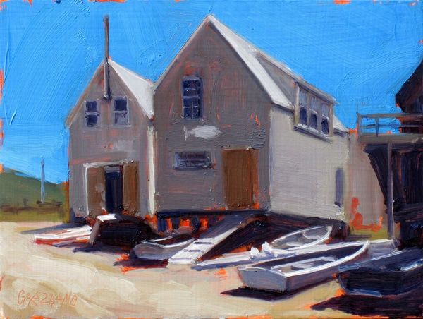 Dan Graziano's "Shrimp Boats" uses oil paint to capture a waterside scene dominated by a large boat at dock. The structural elements of the composition, particularly the angular lines of the boat's rigging, create a dynamic tension against the flat expanse of the sky. The bright orange framework contrasts with the cool blues, generating a visual rhythm. The artist employs thick, visible brushstrokes which add texture and materiality to the piece, emphasizing the physical presence of the boat and dock. Graziano’s structural decisions resonate with ideas about how we perceive depth and space. The painting plays with the semiotic relationship between color and form. As we consider the painting’s construction, its dynamic interplay between color, texture, and line offers an intriguing insight into the artist's exploration of materiality and perception. This painting challenges the viewers' expectations, encouraging an ongoing dialogue between art and the observer.