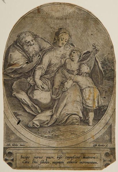 Editor: We’re looking at "Scene fra Jomfru Marias liv" by Israhel van Meckenem, made between 1440 and 1503. It's an engraving, so it’s all lines, and the detail is amazing for such a small piece. The circular composition and linear quality make it quite striking. How do you read the structure of this piece? Curator: Note the controlled use of line, achieving varied tonal values from light to dark. The artist has considered the organisation of the elements to direct the viewer's sight. Observe the central positioning of the Virgin and Child. Their stable, draped forms act as a visual anchor. Consider how the flanking figures converge, their lines of sight all directed toward that central point, reinforcing a visual and conceptual hierarchy. What is your response to this use of structural stability? Editor: It feels very balanced, very formal. Is the lack of shading typical for this period? Curator: Absence of full tonal modelling shifts focus toward the integrity of the lines themselves. Each mark gains significance, emphasizing delineation and shape. Consider also how the density of the lines generates volume, yet contains the figure within the plane. It prompts questions around surface and depth, and figure-ground relationships within this visual construct. It requires our understanding to create the values for volume and depth through the organization and structure of marks. Editor: I see. So, the artwork focuses on lines as essential components and relies on viewers to do more work for definition. It emphasizes careful composition of visual information rather than shading to depict dimensionality and realism. Curator: Precisely. Through understanding line, form, and space, and deconstructing the relationship between them, one will ultimately see a deeper reading to Van Meckenem’s work. Editor: This approach highlights the structural elements of the art, and it’s made me see more clearly the intention behind its form. Curator: Indeed. Focusing on these intrinsic components often grants insights inaccessible through other avenues of interpretation.