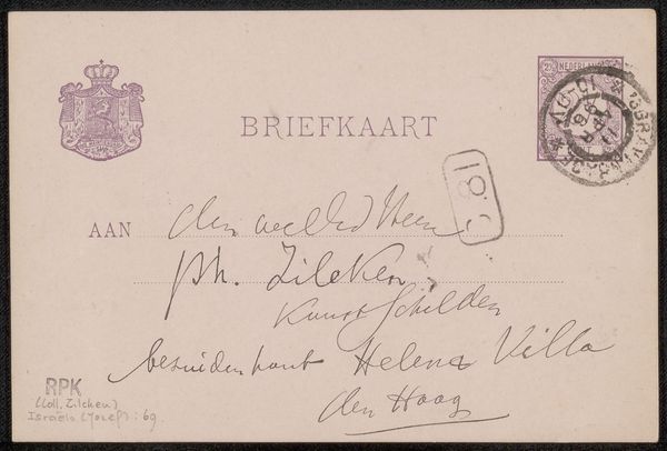 Editor: This is Jacob Maris' "Briefkaart aan Philip Zilcken," likely from 1892, a pen and ink drawing on paper. It’s surprisingly delicate, given its everyday purpose. What visual echoes do you see in this unassuming work? Curator: Indeed. It seems simple, but consider the weight each of these elements carries. The Royal crest embossed on the upper left, the postage stamp on the right. These aren’t merely decorative; they’re assertions of authority, commerce, and connection. This "briefkaart" serves as both an invitation and a contract. How does the hand-written address modify that? Editor: It makes it more personal, of course. The stamp and crest are quite formal, but the cursive adds an intimate touch, and soften it. Curator: Precisely. It’s the interplay between the formal and informal that fascinates me. Notice how Maris doesn’t obliterate the pre-printed text “Briefkaart.” It's consciously integrated, reminding us that communication always operates within a pre-existing framework, shaped by social and cultural norms. The artist is using multiple levels of meaning within one small form, what does the receiver decode consciously versus subconsciously? Editor: That's something to ponder; to consider the multiple visual and textual voices present is powerful. I suppose the modern equivalent would be an email incorporating emojis! Thank you for shedding light on this. Curator: A fascinating thought. Today we expect all correspondence to express our brand, yet authenticity is valued. The tension still exists. Food for thought indeed.