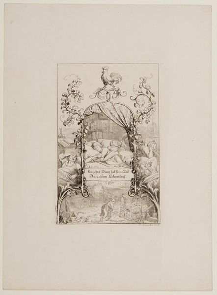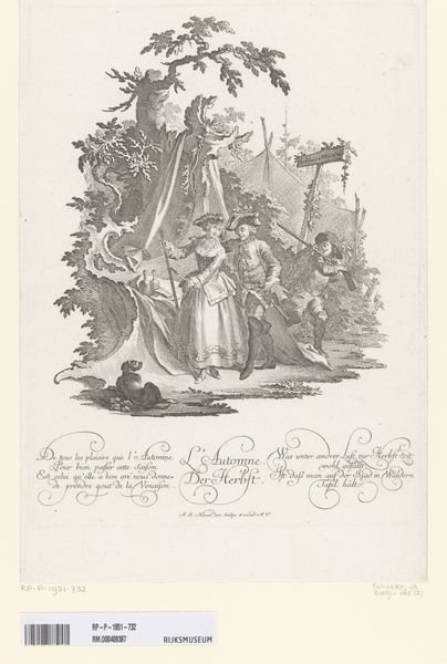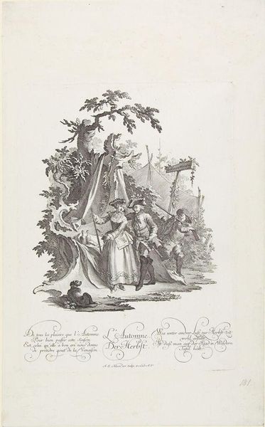 Curator: Here we have Johann Esaias Nilson's "Summer," an engraving held at the Harvard Art Museums. Editor: It's a highly stylized garden scene, dense with ornamental flourishes. I immediately notice how the monochromatic scheme emphasizes the elaborate textures. Curator: Nilson captures "Summer" through allegorical figures set within a carefully constructed landscape. The garden itself, complete with statuary and cascading water, acts as a symbol. Editor: Yes, the composition is notably staged. Look at the figures, frozen in almost theatrical poses, framed by the architectural elements and abundant foliage. The contrast between the light and dark creates a dramatic effect. Curator: Consider too the clothing and gestures. They speak to a very specific understanding of leisure and social hierarchy. The garden becomes a stage for displaying status and refinement. Editor: The scale, revealed by the dimensions of the plate, suggests this would have been viewed intimately. A personal object, perhaps, reinforcing societal ideals on a small scale. Curator: Precisely. It is a delicate encapsulation of a cultural ideal, rendered with intricate detail. Editor: A fascinating distillation of form and meaning.