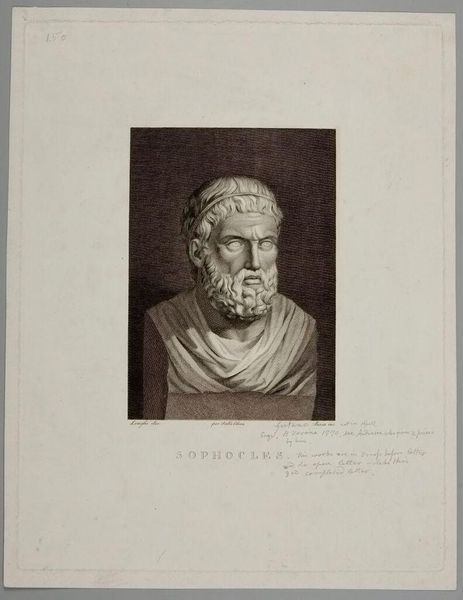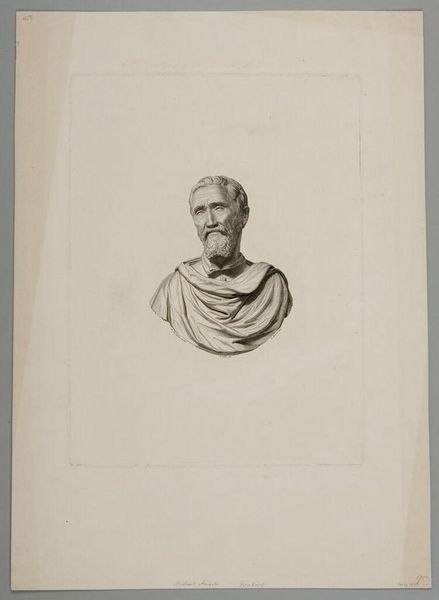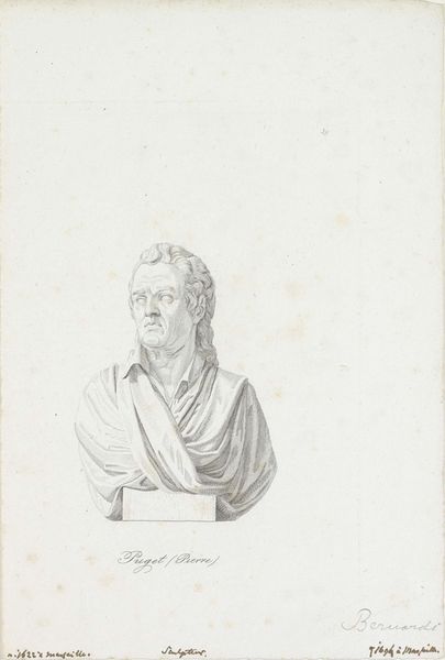 Curator: Welcome. Before us we have "Mannenkop naar Grieks voorbeeld" or "Head of a Man after a Greek Example" by Johannes de Mare, created in 1824. It's a pencil drawing, seemingly on aged paper. What strikes you first about this work? Editor: The immediate impression is one of serenity. Despite the inherent stillness of the subject—a stone bust, no less—there’s an incredible sense of peace emanating from this work, and the delicate linework contributes to its ethereal quality. Curator: Indeed. Note the artist’s careful rendering of form through line and shading. The hatching technique, particularly evident in the beard and hair, creates volume and texture with remarkable efficiency. Observe how de Mare has deployed classical principles of proportion and anatomical accuracy. Editor: Absolutely. It seems de Mare uses this figure to invoke an almost timeless feeling. The man depicted is an archetypal image, one which harkens back to Greek ideals of masculinity and wisdom. I'm reminded of philosophers, thinkers whose visages became synonymous with stoicism. Curator: Precisely! The choice to emulate a Greek sculpture is deliberate. Neoclassicism in this period sought to revive the perceived purity and order of ancient art, rejecting the drama of the Baroque and Rococo. This image represents the elevation of reason, order, and restraint. The light-colored palette enhances this classical impression. Editor: I find myself focusing on the eyes. They are so human, conveying intelligence. Considering it's rendered simply in pencil, the expressiveness achieved is profound. I wonder about the personal connection the artist may have felt towards these classical ideals. Curator: It serves as a testament to the power of line as a tool for both accurate representation and emotional expression. Editor: It invites reflection. It seems to quietly implore a return to what we may remember as the cornerstones of culture. A stoic reflection on humankind’s higher capacities. Curator: Indeed, a convergence of technique and intellectual ideals, beautifully synthesized on paper. Editor: A visual echo, perhaps, from an era the artist deeply revered.
