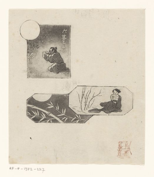 Editor: This woodblock print, "De kou trotserend, zetten onze troepen bivak op te Yingkou," was created by Kobayashi Kiyochika in 1895. The somber color palette and depiction of soldiers in the snow create a poignant mood. What do you see in this piece from your perspective? Curator: I am struck by how Kiyochika portrays the industrialization of warfare through the lens of ukiyo-e traditions. Consider the printmaking process: each color, each line, meticulously carved into woodblocks, requiring skilled labor and a complex division of artistic and manual work. What does it mean to depict a modern, mechanized conflict using such a labor-intensive, craft-based medium? Editor: That's fascinating. It highlights a real tension, doesn't it? The modern military versus traditional artmaking. Curator: Precisely. And consider the social context. This print was likely mass-produced for popular consumption, turning images of war into commodities. Think about the role of woodblock prints in disseminating propaganda and shaping public opinion. Is this simply documentation or also celebration of Imperial Japan's military actions during the First Sino-Japanese War? Also note the presence of the Red Cross, juxtaposed with the difficulties implied for the soliders in "braving the cold" according to the title; there's perhaps something subversive intended about critiquing modern forms of support alongside modernization. Editor: So you're suggesting the print's value lies not just in its aesthetic quality, but in its function within the wider social and economic system? Curator: Exactly. The print is a material object deeply embedded in the economic and ideological structures of its time, its value created through a collaboration between artist, artisans, publishers, and consumers. We cannot ignore this aspect of art making and the messages about labor or commodification in times of war and peace it shares. Editor: I never thought of it that way. This makes me see it in a completely different light. Curator: These tensions between the labor invested, its production techniques, and its subject provide very fertile ground for thinking about both modernism, military, and Japan's role in a global market.
