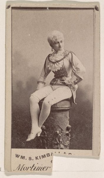 Editor: This is "Card Number 9, Lester, from the Actors and Actresses series," an albumen print dating to the 1880s by W. Duke, Sons & Co. I'm struck by how the sepia tones and staged backdrop give it a theatrical quality. What are your thoughts? Curator: It's fascinating to consider these trade cards within the context of burgeoning consumer culture and gender performativity. How does the figure of "Lester," likely a female actor, disrupt or reinforce Victorian-era social norms? Editor: Disrupt? In what way? Curator: Well, the image presents a female figure embodying a traditionally masculine role through costume and pose. Consider how these mass-produced images contributed to the visibility and, potentially, the acceptance of gender fluidity within the public sphere. What can you observe about the clothing itself? Editor: It looks like stage attire: elaborate, perhaps intentionally exaggerated. Is that designed to make the representation "safe" for audiences? Curator: Precisely. The theatrical context acts as a kind of buffer, allowing for exploration of gender roles while maintaining a safe distance from everyday realities. Furthermore, what’s the relationship between this image, advertising, and the construction of celebrity? Duke used her image to promote cigarettes; in doing so, wasn’t she becoming an object of consumer desire? Editor: That's a point I hadn’t fully considered. It’s not just about representation, but commodification as well. I guess I see that commercial aspect now; her persona as a thing to be consumed. Curator: Absolutely. This small card unlocks conversations about labor, performance, gender and the ways visual culture shaped and continues to shape our understanding of identity.