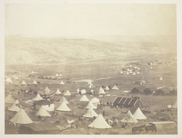 Karel Alexander Enklaar made this small, sepia-toned photograph, Legerkamp bij Oldebroek. Immediately, the eye is drawn to the arrangement of tents. They are structured in rows which recede into the distance. The tents are simple geometric forms, and their repetition creates a strong pattern across the composition. This ordered arrangement speaks to a sense of military discipline and organization. The figures, presumably soldiers, are scattered around the tents, yet they do not disrupt the overall structured feel. The light and shadow define the triangular faces of the tents, emphasizing their shape and form. The photograph's composition invites us to consider how the artist imposed a sense of order onto a temporary military encampment. The choice to use a monochromatic palette further abstracts the scene, reducing the landscape to essential forms and shapes. The effect is less about documentary and more about how the artist manipulates the visual elements to communicate a broader idea about structure. Even here in an austere photograph we recognize how formal qualities interact with wider cultural and philosophical considerations around control and order.