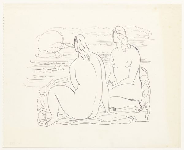 Editor: This is Edvard Munch's "Alpha and Omega", created between 1908 and 1909, it's a lithograph, an ink and graphite drawing on paper. It's… unsettling. The figures are so stark, so vulnerable. What do you make of this work? Curator: Ah, yes, Munch, wrestling with love and loss again! For me, this piece speaks to the primal forces at play in human relationships. Look at the landscape, almost desolate, mirroring the inner turmoil. It’s as though the figures have been cast out from some kind of Eden, wouldn’t you agree? What is your interpretation of the woman’s gaze? Editor: She almost looks… predatory? The man is so vulnerable lying on his back while she watches over him. Almost vampire-like. Is this typical for Munch? Curator: Exactly! Munch was a master of conveying psychological intensity. He often portrayed women as both nurturing and dangerous, reflecting his complex relationships and anxieties. Do you see the symbolism hinted at in the title – Alpha and Omega – suggesting a beginning and end, maybe of innocence, a relationship or perhaps life itself? I feel Munch's use of stark lines amplifies the anxiety in the image. Editor: It makes it feel… unfinished? Like a fleeting moment, captured imperfectly. It does feel symbolic, it's much more about feeling, not literal storytelling. Curator: Precisely! The emotional impact is immediate, almost visceral. Munch sought to portray raw human emotions, unvarnished. Think of "The Scream" for example! It's less about perfection, more about authentic emotion, or our own reaction to the work. So, has our brief look changed how you view the work now? Editor: Definitely. I came in thinking it was purely bleak, but now I see more complexity, a real push and pull, and how he wanted to display real and often frightening emotions. Curator: Excellent. Sometimes, all that’s needed is a glimpse behind the canvas to appreciate a little more.