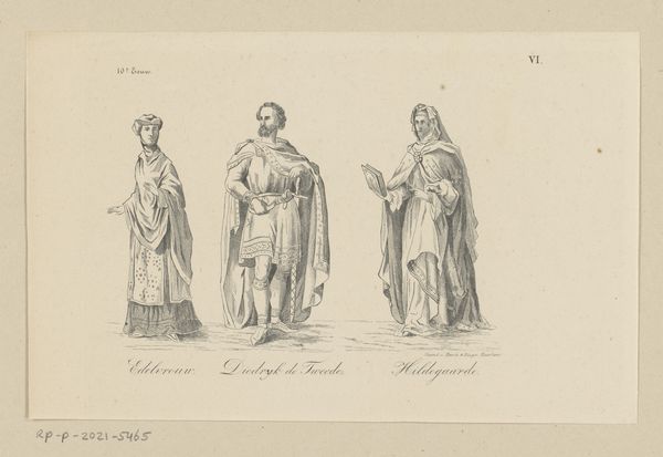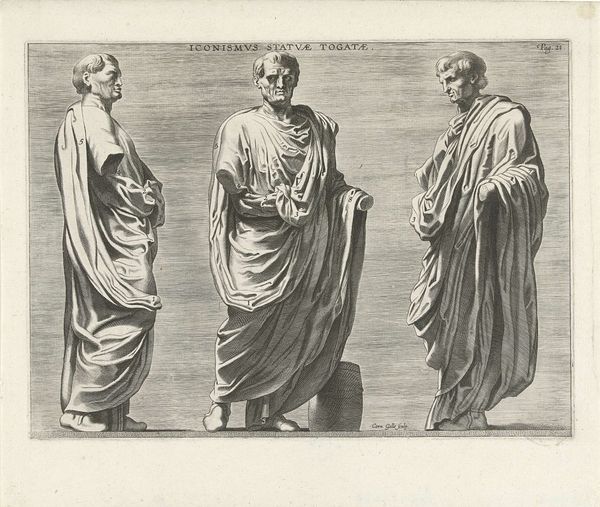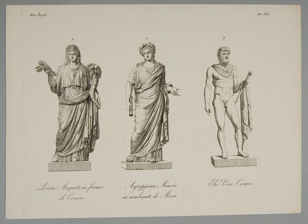 Editor: This print by Gaetano Bonatti depicts Sabina, wife of Hadrian, as Concordia, alongside another figure called Adorante. The classical drapery is so elegant. What do these figures and their gestures tell us? Curator: The imagery of Sabina with a cornucopia speaks to the Roman ideal of abundance and harmony, but also to the empress as a maternal figure. Think of how these symbols reinforced imperial power. What emotional resonance do you see in these carefully constructed representations? Editor: So, the visual language creates a connection between the ruler and the well-being of the empire. It's a powerful use of symbols! Curator: Exactly. These images evoke stability and prosperity by linking the empress to ideals of abundance, influencing cultural memory long after her reign. Editor: That's fascinating—I'll definitely look at classical art with new eyes now.