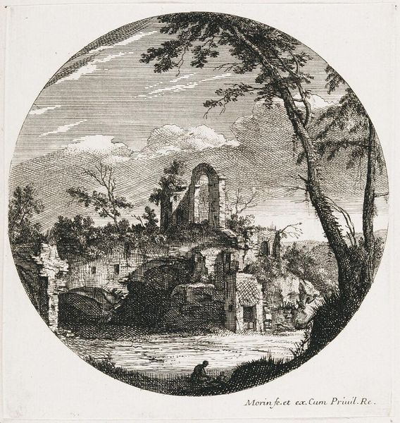 Editor: This is "Romitorio a Albano" by Jacob Wilhelm Mechau. The architectural ruins and the people in the foreground give me a sense of timelessness. How does this image fit into the artistic landscape of its time? Curator: Mechau created this print during a time when the Grand Tour was popular. It romanticizes the Italian landscape and ancient ruins, catering to the tastes of northern Europeans seeking cultural enrichment. How do you think this image contributes to the construction of Italy as a site of historical and artistic significance? Editor: It seems to reinforce Italy's image as a place of ancient beauty and cultural importance for visitors. I hadn't considered how prints like this played a part in shaping that perception. Curator: Precisely. And prints like this also helped disseminate artistic styles, influencing artists far beyond Italy's borders. Now, what does this say about the power of art and its role in society? Editor: This has broadened my view; it's more than just an image of ruins. Thanks! Curator: Indeed. Considering the social context unlocks new layers of understanding.