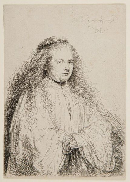 Jan Lievens created this etching, “Bust of a Young Girl with Loose Hair,” using delicate lines to capture light and form. The girl’s profile, rendered with a precise economy of line, contrasts with the voluminous, almost wild hair cascading around her face and shoulders. Notice how Lievens uses the etching technique to explore texture. The varying density of lines creates areas of shadow and light, giving depth and volume to the girl's hair. The stark contrast between the smooth skin of her face and the chaotic tangle of her hair introduces a tension, a play between order and disorder. Consider the context in which Lievens was working. The Dutch Golden Age was a period of intense interest in realism and naturalism, but also one in which artists were beginning to experiment with more expressive and subjective forms. Here, the artist’s attention to detail is combined with a palpable sense of energy and movement. Through this expressive use of line and texture, Lievens captures not just the likeness of a young girl, but also a certain vitality and freedom.