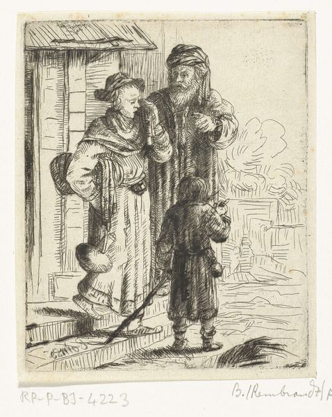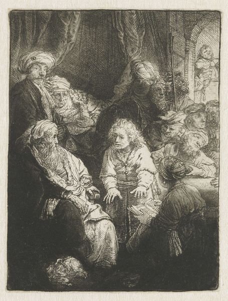 Editor: This etching by Adolphe Alexandre Dillens from 1868, titled "Three men on a ship around a monk with a rosary in his hands," feels surprisingly intimate. There's this casual crowding around the central figure that draws me in. How do you interpret this work, seeing as it presents a slice of life seemingly frozen in time? Curator: The frozen moment is key. The grouping around the monk speaks volumes. Look at the details—the monk’s rosary juxtaposed with the flute player in the background. Are we looking at a commentary on earthly versus spiritual pursuits? The ship itself is a powerful symbol. Editor: In what way is the ship symbolic here? Curator: The ship, throughout history, has been a vessel of transition, a space of in-between. Dillens captures the push and pull of secular versus sacred right in that shared space. The men, seemingly indifferent or amused by the monk, reflect the complex relationships society has always had with religious figures. Editor: That's fascinating! So the image works as a snapshot reflecting society's attitudes? Curator: Precisely. Etchings like this often served to hold a mirror to cultural norms. This print would likely circulate widely, planting this meditation in diverse viewing contexts, both reaffirming or challenging their social mores. Even the ‘genre painting’ aspect highlights its concern with capturing everyday life. Editor: I hadn't considered that before. The way Dillens uses everyday life to talk about broader themes of faith and society...it is a powerful approach. Curator: Indeed. The enduring power lies in that seemingly casual gathering of figures holding weighty symbolic implications. What started as a curious slice-of-life unveils itself to reflect deeper truths about humanity itself, when the symbols it presents become apparent. Editor: I feel like I’ve really begun to understand not just *what* is depicted, but *why* such subjects were captured and preserved in artworks from this period. Curator: Exactly! Recognizing the loaded meaning imbues them with power across centuries.