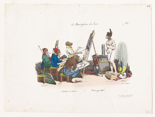 This print, "Diverse mensen marcheren achter de Dood aan", was made by Jean Ignace Isidore Gérard Grandville. The print is made using lithography, a process that democratized image-making in the 19th century. In lithography, the artist draws on a stone or metal plate with a greasy crayon, then applies ink, which adheres only to the drawn areas. This allows for relatively quick reproduction, making images accessible to a wider public, and is a world away from the labour intensive crafts of engraving or etching. The choice of lithography as a medium underscores the print's social commentary. Grandville depicts Death leading a diverse procession of people, perhaps suggesting the inevitability of mortality for all, regardless of social status. The lithographic process itself, with its capacity for mass production, mirrors the leveling effect of death. The print thus becomes not just a depiction of social critique, but a product of the very forces it critiques, highlighting the complex relationship between art, production, and society.
