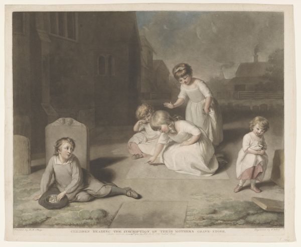 Charles Howard Hodges created this print, "Children in a Cemetery," using the technique of mezzotint. This process involves roughening a copper plate to create an image that is rich in tone and texture, and can involve a high degree of handwork. Looking closely, you can see the almost velvety quality of the shadows, achieved by carefully scraping and burnishing the plate. The scene shows children interacting with gravestones, a poignant subject reflecting the high mortality rates of the time. Mezzotint allowed Hodges to capture the delicate nuances of light and shadow, enhancing the emotional impact of the scene. In contrast to industrial printmaking processes, mezzotint required significant skill and time, making each print a unique piece. The labor-intensive nature of this technique reminds us of the value placed on craftsmanship in a pre-industrial era. Understanding these processes helps us appreciate the social and cultural context in which the artwork was made, bridging the gap between art and craft.