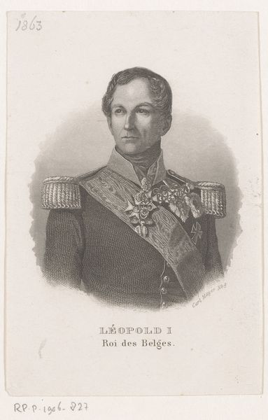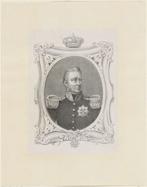 This is an undated portrait of Willem I Frederick, King of the Netherlands, created by an anonymous artist. Its formal elements consist primarily of fine lines and tonal gradations, rendered with precision to capture details of regal attire and facial features. The composition is structured around the King’s figure, which occupies the visual center, flanked by drapery, with a neutral background, that provides little spatial context. The choice of monochromatic tones invites a structural analysis. The absence of vibrant colors places emphasis on form and texture, highlighting the hierarchical structure inherent in portraiture. The King's firm gaze and posture are coded signs of authority, while the use of line and shading suggests a concern for realism and a rational representation of power. The artist uses this approach to emphasize certain attributes of the King, contributing to a constructed image of leadership and control. Each element works not just aesthetically but as part of a larger cultural narrative.