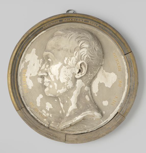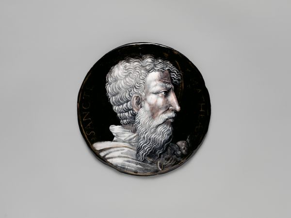 Editor: This enamel sculpture, "Saint Mark" by Jean III Pénaicaud, dates from 1545 to 1555. It's such an intimate portrait, yet its rigid profile creates a sense of distance. How do you interpret this work in terms of its historical and social contexts? Curator: I see a fascinating dialogue between power and piety embedded in this piece. Enamel work, particularly in the Renaissance, was often associated with luxury, and therefore, the aristocracy. Who did it serve? Was it displayed privately, or did it hold a more public facing role? The very choice of Saint Mark, one of the four Evangelists, signals a powerful message—a fusion of religious authority with worldly influence. Editor: That’s interesting. The choice of enamel seems less about personal expression and more about projecting a specific image, then? Curator: Precisely. And let's consider the profile view. It's a very deliberate stylistic choice echoing ancient Roman imperial portraits, connecting the Church with the legacy of empires, therefore power. Is Pénaicaud commenting on or reinforcing existing hierarchies by referencing this visual language of power? Editor: So it is more than just a portrait of a saint; it is a statement about institution, lineage, and authority through style and material? Curator: Exactly. How does this piece prompt us to reconsider not just religious iconography but also its engagement with structures of power and influence that prevail through centuries, and their inherent social inequalities? Editor: I hadn’t considered that interplay between religious art and social dynamics. Thank you; that's given me a lot to think about. Curator: It also gave me the opportunity to think on the subject through your observation; art unveils something new at each visit.