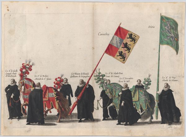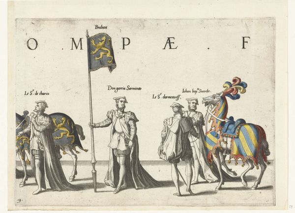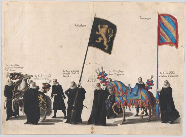 This print, "Part of the Procession, No. 6," was made by Joannes van Doetechum in the late 16th century. Doetechum used an engraving technique, cutting lines into a metal plate, inking it, and pressing it onto paper. He then added color by hand, a labor-intensive process. The choice of printmaking as a medium is significant here. It allowed for the relatively quick reproduction of images, making them accessible to a wider audience. This was crucial during a time of political and religious upheaval, when the spread of information was paramount. The scene depicts a ceremonial procession with lavishly decorated horses and a flag bearer. The intricate details of the costumes and heraldry suggest a celebration of power and status. But, let’s consider the labor that went into creating this image. Doetechum's craftsmanship, combined with the print's potential for mass distribution, speaks to the complex relationship between art, labor, and social power in the early modern period.