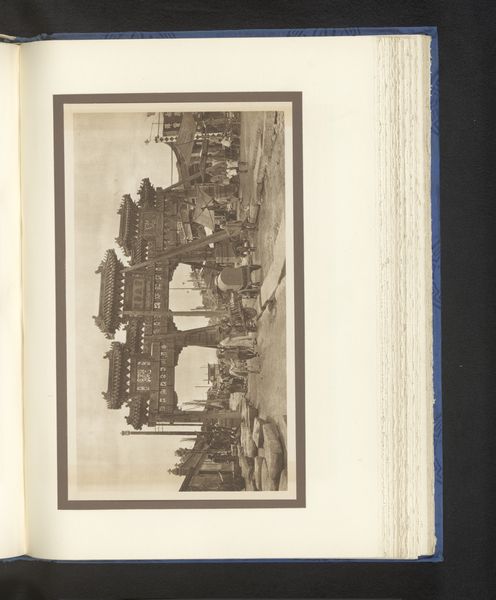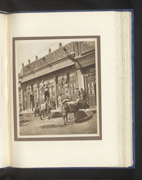 This is a photograph titled, "Straatgezicht te Peking" by Donald Mennie. Captured in a sepia tone, the photograph presents a street view in Peking. The composition is structured by the receding lines of the street and buildings, creating a sense of depth. The architectural elements, with their vertical posts and horizontal canopies, create a grid-like structure that orders the scene. Mennie plays with light and shadow, using the sun to cast strong shadows that emphasize the geometric forms of the buildings and the figures walking along the street. These contrasts not only add visual interest but also serve to highlight the material qualities of the architecture. This structured composition, combined with the tonal range of the sepia print, invites us to consider how the photograph mediates our perception of space and culture. The photograph functions not just as a record but as an interpretation of a specific time and place.