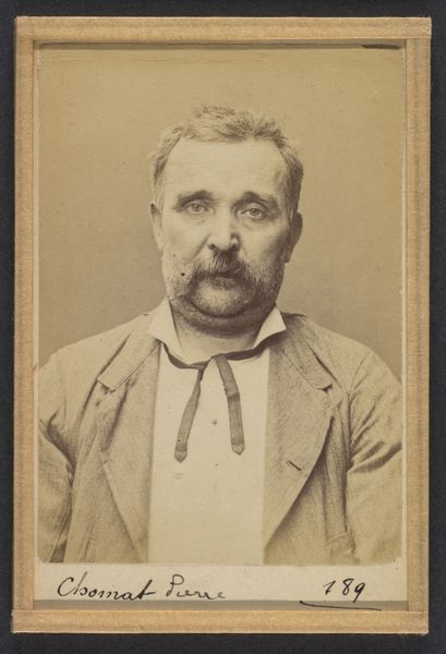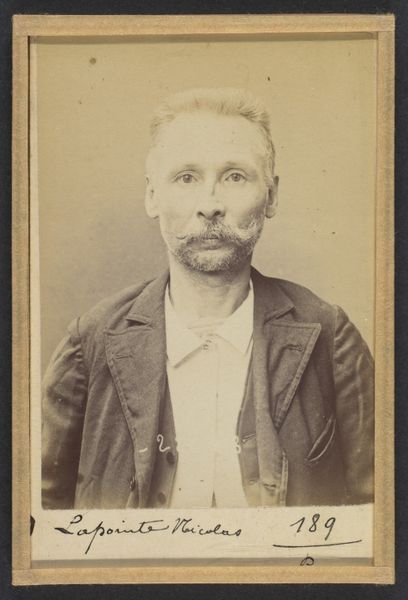This is an albumen print made in France in 1894 by Alphonse Bertillon. It depicts Nicolas Catty, a 47-year-old mechanic and anarchist. Bertillon was a French police officer and biometrics researcher who invented the mugshot. His "anthropometric photography" was meant to create a scientific system of identification, a technique used to classify and track criminals, the image is inscribed with Bertillon's labeling system. It includes the subject’s name, age, profession, political affiliation, and the date the photograph was taken. This image reflects anxieties of the time, in particular fear of anarchism. The institutional history of photography and policing shaped the way people were viewed and controlled. Bertillon's method was adopted worldwide, transforming how law enforcement agencies document and perceive individuals. Understanding this photograph requires researching the history of criminal justice, the rise of photography, and the social context of late 19th-century France. Studying Bertillon’s work provides valuable insights into the intersection of science, power, and representation.