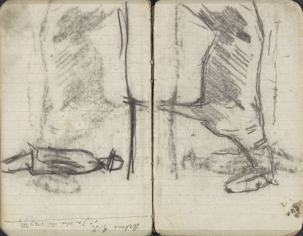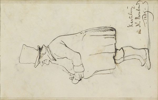 This work, "Man, van achteren gezien, en een meisje", was created by Johannes Tavenraat using pen in brown and brush in gray. The composition is stark, split into distinct zones, with the figures rendered through sparse, economic lines. Notice the man viewed from behind: his form reduced to essential contours, emphasizing shape over detail. This minimalist approach mirrors structuralist ideas, highlighting the underlying framework. Then, look at the girl, her presence delineated through gray washes, giving her a spectral quality. Tavenraat uses a semiotic language, where each line and shadow serves as a signifier, prompting viewers to piece together meaning from minimal cues. The rough texture, particularly in the girl’s rendering, unsettles established notions of beauty, engaging with new ways of seeing. The artwork invites ongoing interpretation. The way that form destabilizes established meanings, offering no fixed narrative, is its most striking quality.