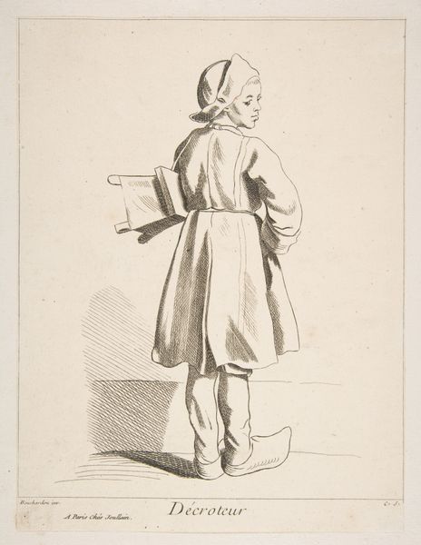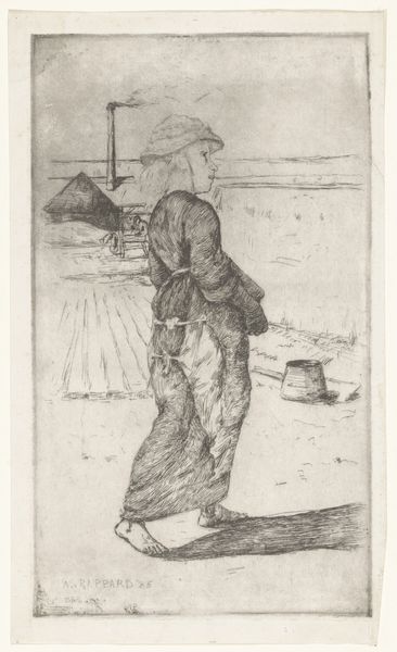 Curator: Looking at this piece, "Vrouw met een cape staand naast een rieten mand," or "Woman with a cape standing next to a wicker basket," a drawing by Isaac Weissenbruch created sometime between 1836 and 1912, now residing here at the Rijksmuseum... there's a delicate weariness about it. Editor: Yes, the lightness of the pencil strokes, almost like whispers on aged paper. You can sense a story etched into every line. I wonder, what burdens does she carry under that cape? It speaks volumes, doesn't it, about the quiet struggles often faced by women of that era. The sketch format is fascinating, making me wonder whether the woman might even be real. Curator: It’s quite intimate. Like peeking into the artist's private sketchbook. It makes me wonder about her station in life; her clothes indicate she isn't affluent, her expression thoughtful as she stands beside her basket. Weissenbruch isn't attempting some grand statement here but more a meditation on everyday existence. Or perhaps even an actual street scene! Editor: Exactly. It grounds the work. Consider the era's social hierarchy. Weissenbruch might be highlighting the working class. This humble portrayal acts as a potent counterpoint to the more idealized depictions. Even that simple basket is loaded, a symbol of labor, perhaps even economic survival for some. This piece, beyond its aesthetic qualities, serves as an entry point into a complex web of historical power dynamics. Curator: I also see a profound grace in the face that can’t be seen. The hidden expression invites speculation and a certain tenderness, if I may say. I do wonder about the placement of the figure in relation to the empty basket. Is this basket waiting to be filled? What does filling it signify? Does emptiness suggest something as well? The mystery makes you linger on details. Editor: I am in agreement, and I feel the woman becomes every woman forced into certain social-economical roles based on a highly stratified social class. Through a lens focused on realism we get a quick lesson on power, labor and societal norms. Curator: The piece continues to fascinate even after the most rigorous art-historical and theoretical assessment. It makes the mind reel to conjure who the woman was and whether she felt the grace I imagined when observing her profile. Editor: Yes, the dialogue between art and society resonates powerfully. Her story echoes through history, and as an observer, the goal isn’t simply aesthetic but one of cultural understanding.