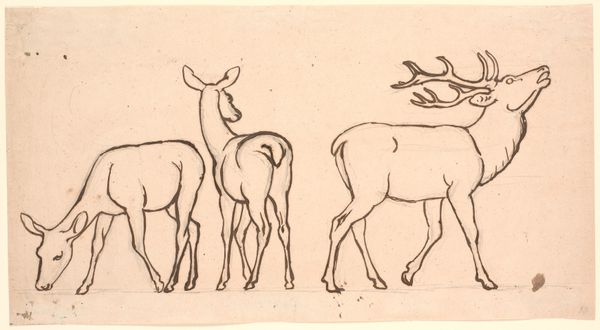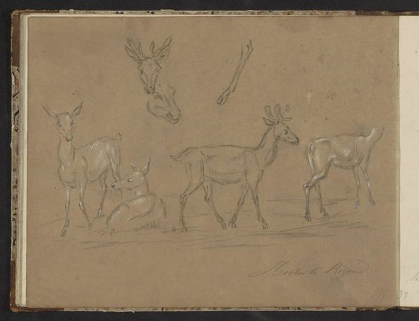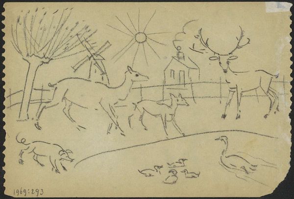 Gerrit Willem Dijsselhof made this drawing of a grazing deer in a meadow with coloured chalk on paper. Isn't it amazing how such a simple medium can be so expressive? The texture of the chalk gives the drawing a soft, almost dreamlike quality. The brown chalk used for the deer contrasts with the sparse use of blue for the grass and distant building, creating a serene atmosphere. The lines are delicate, almost tentative, as if Dijsselhof is feeling his way through the image. Look at the deer's legs, how they're rendered with such minimal detail, yet they convey a sense of movement and grace. It reminds me of some of the early modernist sketches, where artists were more concerned with capturing the essence of a form than with photographic realism. Maybe someone like Franz Marc, who also loved animals, would appreciate the gentle simplicity of this drawing. Anyway, it’s a reminder that art is as much about feeling as it is about seeing.
