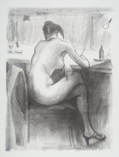 Curator: Elmer Bischoff's "Girl Looking in Mirror," completed in 1962, presents us with a stark scene rendered in ink. Editor: It hits me immediately as vulnerable, yet also withdrawn. There's a real push and pull in the emotions I'm picking up from the subject. Curator: Bischoff, known for his transition from Abstract Expressionism to figuration, uses the nude here to perhaps comment on the performative aspects of femininity and societal expectations during the mid-20th century. Ink as a medium, being relatively inexpensive and immediate, lends itself to studies of form and explorations of the body outside the rigid structures of traditional academic painting. Editor: That rawness translates directly. The line work, it's urgent. Not delicate at all. More like searching... feeling its way around the curves. Do you get the sense that the mirror might not even be there at all, though it's presented to us? That this whole act of looking might just be about feeling seen and understood from the self? Curator: Interesting. We could also read the materiality of the ink itself, its gradations from thick, pooling darkness to almost translucent washes, as symbolizing the very instability of identity. How external perception – in this case, a reflection – is never a fixed point, always shifting in value. The ink application allows for an atmospheric play that speaks to intangible experience, which aligns with ideas Bischoff himself explored in transitioning from Abstract Expressionism. Editor: It’s that pooling you mentioned. The way he uses the ink almost makes it bleed into her contours. Like the identity isn't solid, or separate from the space she's trying to see herself within. I feel an almost uncomfortable intimacy because of that. A confrontation, even. Curator: I agree. I appreciate how this piece brings to the surface conversations on labor within art practice as it balances expressionist concerns and more calculated depictions of the figure through its material rendering. Editor: To sit with it for a moment reveals a complexity in its apparent simplicity... maybe that's its power, huh?
