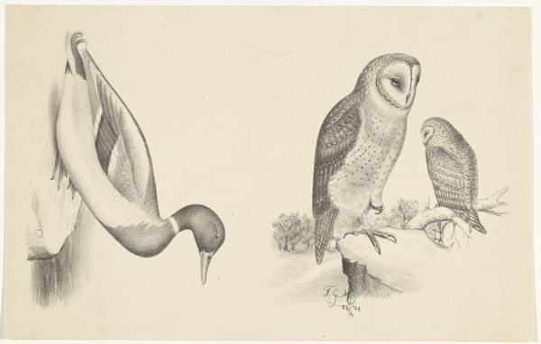 William Holbrook Beard created this drawing of an owl on paper, capturing the bird's intense gaze with delicate linework. The composition centers on the owl, perched on a branch, its form defined by a network of intricate strokes. Notice the texture created through hatching and cross-hatching, building depth and volume. The surrounding foliage is rendered with a similar technique, blurring the distinction between the subject and its environment. This visual blending challenges our perception of figure and ground, inviting us to consider the owl as an integral part of its habitat. Beard's choice of a monochromatic palette directs our attention to the subtle tonal variations, highlighting the formal qualities of line and texture. In essence, the drawing encourages a reflection on how we perceive nature, blurring boundaries and challenging fixed categories.