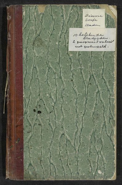 Curator: This is a sketchbook from 1883, attributed to George Hendrik Breitner. It's composed of nine sheets of paper, utilizing mixed media techniques including drawing, watercolor, and colored pencil. The sketchbook is currently held at the Rijksmuseum. What strikes you first about this artifact? Editor: It has a rather austere and aged appearance. The cover's faded turquoise hue is visually compelling, but also suggests themes of time, preservation, and perhaps, concealed narratives. Curator: Indeed. The age of this sketchbook implicates broader narratives about artistic practice during Breitner’s time. Considering its place within his body of work and the social contexts of 19th-century Amsterdam, how does this format itself contribute meaning? Is this simply a tool, or is the sketchbook imbued with deeper significance? Editor: I’m particularly interested in the marbled paper. These patterns resonate with similar motifs that are echoed throughout time, like flowing rivers or root systems. We could understand the sketchbook itself as a symbol of an artist’s journey of exploration and visual thought process, tracing and containing their observations. Curator: A compelling parallel. Given that a sketchbook inherently implies process rather than presentation, could its unedited form potentially be interpreted as resistance against the rigidity of the established art world? Or could it reveal artistic vulnerabilities? Editor: The raw, unfiltered view we get allows for more authentic access to Breitner's perception of the world. Sketchbooks can hold a more profound kind of "truth". Curator: A compelling argument. By considering this artifact, and thinking about the role it played in Breitner's work and the cultural context from which it emerges, perhaps we might think further about the potential art historical disruptions archives introduce. Editor: And perhaps about what meanings remain, captured in the symbolic weight of its visual textures.