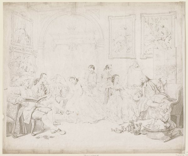 Curator: This is Joseph Highmore's sketch, "Family Group of Six Persons in a Room," a study for a painting, held here at the Tate. Editor: There's a tender intimacy to the composition, even though it's just pencil on paper. I find it interesting how the framing device is built right into the drawing. Curator: Yes, Highmore was exploring not just the spatial dynamics of a family unit, but the performative aspects of familial roles. Look at the father figure—almost posed. Editor: And the woman reclining in the bed. What does it suggest about her social role, confined to the domestic sphere? Is this a commentary or just a reflection? Curator: Perhaps a bit of both. It's a glimpse into the constructed nature of family life in the 18th century, capturing a moment framed, quite literally, by societal expectations. Editor: It leaves me with a lingering sense of lives carefully arranged and somewhat confined, but also with a recognition of the enduring, if complicated, nature of family.