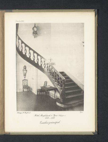 Curator: Looking at this photograph, there’s something undeniably melancholic in its stillness, don't you think? It is quite literally, black and white! Editor: This photographic print, "Trappenhuis in een woning," believed to have been created between 1895 and 1897 by Caroline Gaudard, showcases a staircase inside a home. The image, monochrome as you observed, really offers an interesting glimpse into late 19th century domestic architecture. What elements contribute to this feeling of melancholy that you sensed immediately? Curator: Well, first, the light—or rather, the way the light is captured. The stark contrast emphasizes the sharp lines and shadows, creating a sense of quiet austerity. And that long carpet on the stairs, leading up into… nothing that is immediately knowable. Also, there are some draped fabrics hanging on the left, with heavy folds. They add to the composition’s weight. Editor: Precisely. Gaudard's control over the photographic process here is impressive, particularly considering the technological constraints of the period. The quality of the print allows us to examine the material culture of the time, doesn't it? The craftsmanship apparent in the balustrade, the way the stairs are made…These details point to a certain class structure and the labor involved in maintaining such spaces. What is made immediately apparent is how this artwork documents an instance of history with the means that it has. Curator: Yes, absolutely. Thinking of labor and history reminds me a bit of genre painting. Yet the way it avoids any figures makes it more striking and starkly formal— almost like a stage set awaiting a performance that never comes. The mood and material— both come across intensely! Editor: The absence of people allows the architecture itself to speak. But in this case, the silence communicates as strongly as any portrait or busy scene, and raises important questions about our human relationship to dwelling and work spaces. This artwork does prompt valuable reflections, doesn't it? Curator: Agreed. What resonates with me now is that this staircase could be located in an apartment anywhere, any time, even the future! What at first seems to convey loss or despair now becomes the architecture for what will emerge after, no matter what changes! It might seem banal but… the photo actually has me feeling energized to confront change, both aesthetically and culturally.