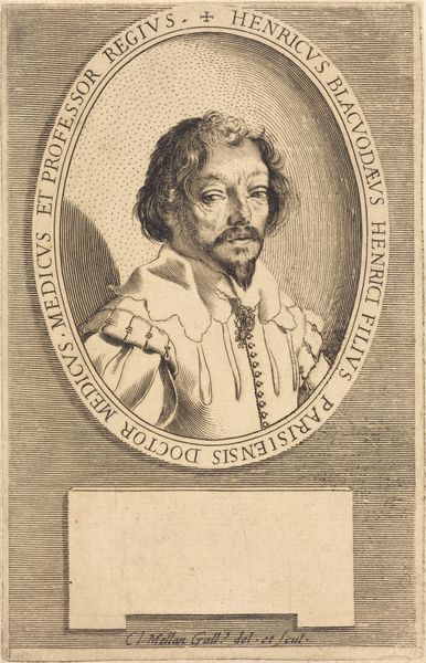 Curator: Here we have Ottavio Leoni's "Giovanni Marino," created between 1623 and 1624. Leoni, an Italian artist, rendered this portrait using engraving and intaglio printmaking techniques. Editor: It’s quite striking, isn't it? Very controlled, detailed lines, but also somehow, intensely alive. The guy just looks like he has stories to tell, probably of daring deeds or epic poems. You can almost hear his voice, dramatic and sonorous. Curator: The portrait's elegance mirrors the subject’s societal standing. Giovanni Marino was a celebrated poet within Baroque circles. Note the precision in capturing Marino’s features, which hints at the patron-client relations of the era and the politics inherent within artistic commissions. Editor: Right! It’s a face that holds a gaze. I mean, look at that lace collar! The way Leoni captured its intricacy with such precise detail—it's dazzling! Makes me wonder, what were the conversations like during those sittings? Did Marino even *like* Leoni? I bet they exchanged words like "picturesque" and "sonnet". Curator: The text surrounding the oval is an essential clue here. Notice how Leoni meticulously balances textual elements with visual representation. The inclusion of "Eques," for instance, alludes to Marino's knighthood and the status he occupied, emphasizing socio-political and intellectual hierarchies of the period. Editor: And I can’t get enough of his cross, swinging at the end of his chest. Honestly, though, look at how much life Leoni gave the face—those eyes have so much fire! It transcends just being a representation, I think, becoming a kind of portal. Almost a cheeky comment on capturing a persona through this very permanent process. Curator: The piece highlights a crucial intersection between art, power, and identity in Baroque Italy. Leoni offers a study that brings forth crucial historical and social frameworks of seventeenth-century patronage and artistic creation. Editor: A snapshot of a flamboyant soul captured in ink... who probably spent hours adjusting his impressive moustache. It definitely leaves me pondering the blurred lines between history, personality, and a piece of meticulously crafted print.