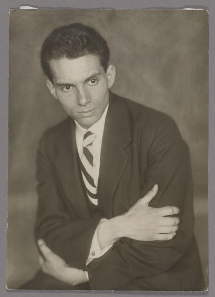 Curator: Here we have a photograph titled "Portret van Don Taylor," created in 1952. The medium is gelatin-silver print, that very classic process of twentieth century photography. What is your first impression? Editor: There is such formality communicated here—a carefully knotted tie, a pressed shirt under a thick woven tweed jacket, all crowned with a fedora. And yet, I see vulnerability, as Don’s gaze is slightly averted. Curator: I find that the hat suggests a powerful symbol. In those days, the fedora stood as an emblem of male identity and authority; but worn by a Black man in 1950s America, it also carried a strong undercurrent of self-assertion against a culture trying to negate identity and self-possession. Editor: Interesting that you would say that, given my feeling of his vulnerability. Gelatin silver prints are fascinating—a process deeply tied to industrialization, requiring factory-produced materials and standardized chemical processes. But it’s also worth pointing out the degree to which photographic portraiture democratized images; this man, in an earlier time, would likely have been unable to afford his own portrait. Curator: The textures—the weave of the jacket, the glossy tie, even the pores of his skin visible thanks to that gelatin silver process you describe—build a kind of psychological terrain. Look closely and you perceive a thoughtful inwardness. It suggests the complexities of Black identity amidst the socio-political tensions and struggles of the era, a balancing act. Editor: The act of representing Don Taylor at that time involved many constraints of materials and manufacturing—but also, you know, consider labor! It takes labor to construct that jacket, and the textile industries, right? All this labor of others going into presenting himself, yet perhaps limiting his actual self. Curator: I appreciate your insight, drawing attention to those industrial roots and labor costs that are embedded even here. Considering that history deepens the sense of Don Taylor deliberately building an outward self to confront a world that challenges him. Editor: Yes, I agree. Seeing the labor in an image helps me to not simply gloss over or immediately accept any reading of symbolism. Curator: Well, in either case, spending time with Don Taylor is thought-provoking, I hope our listeners are keen to draw their own insights, as well! Editor: Agreed. It's rewarding to analyze portraits like this one, peeling back the layers of context and intention to enrich our understanding of material existence.