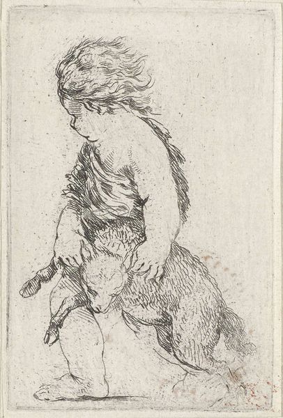 Editor: So, here we have "Kneeling Man Embracing a Woman," an ink drawing, possibly also a print, by Bernard Reder. There's such starkness to the scene, like a snapshot of raw emotion caught in rough lines. I can't help but feel a little disturbed by it. What do you see in this piece? Curator: That rawness, that’s the pulse of it, isn't it? It's a woodcut feel in the execution, a direct, almost brutal transfer of feeling onto the paper. The contrast screams, almost literally. Think about the figures; they're caught in a moment, perhaps a forced one, and is that a dagger? It speaks to an intimacy twisted, a vulnerability weaponized, perhaps. The dark, heavy lines surrounding them only add to the feeling of enclosure, don't you think? Does that inform or distort the way that we should understand what Reder wanted the artwork to do? Editor: "Vulnerability weaponized"—that’s powerful! I was focusing on the seeming embrace, but your mentioning the dagger makes me completely re-evaluate. It goes from appearing romantic, to downright menacing in just a second. Curator: Exactly! Reder often played with these tensions. He uses stark, angular forms, almost as though he's chiseling away at our preconceptions. What starts as a familiar trope – love, embrace – is then undercut with discordance. It's that constant push-and-pull that I find so captivating. And really rather disturbing. Editor: I can see that now! It’s like he is revealing the shadows within relationships, rather than portraying a straightforward scene of love. I came in thinking this was a simple, if a bit rough, drawing. But it turns out there's a whole world of conflicting emotions lurking beneath the surface. Curator: Indeed. And isn’t that just like life, sometimes?
