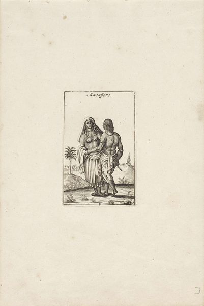 Editor: This engraving, titled "Khoikhoi," comes to us from Pieter Schenk, sometime between 1682 and 1711, and it's held at the Rijksmuseum. What strikes me is the way the figures are presented; there's a formality, almost like a staged portrait, despite what I assume is meant to be a natural setting. How do you read the composition? Curator: The formality gets me too; it is as if the artist meticulously recreated them with the same kind of attention one might give classical gods. And Pieter Schenk – his hands were steady! But I always wonder about the "gaze" through which such images are created. The scene becomes, I suspect, a window onto European perceptions more than a mirror reflecting reality for the Khoikhoi people. Does that distinction hit home for you? Editor: Definitely. It feels like we’re seeing them filtered through a European lens, almost as objects of curiosity, rather than as individuals with their own stories. Curator: Precisely. I imagine the narrative crafted here likely prioritized European viewers’ expectations and fantasies about exotic lands, not genuine engagement. Perhaps Schenk aimed to fuel a certain… "thrill" I suspect was of importance in baroque engraving… And there’s that word at the top; is it naming the sitters? That's never a neutral act either, is it? Editor: I suppose not. Names carry so much weight, and the potential for misrepresentation is huge. It definitely shifts my understanding to consider how it would have been seen originally. Curator: And that consideration makes the difference, right? Shifting perspective – maybe that's our collective task. After all, every gaze holds power; acknowledging its origin seems to free us to look again. What a fruitful path to begin on!