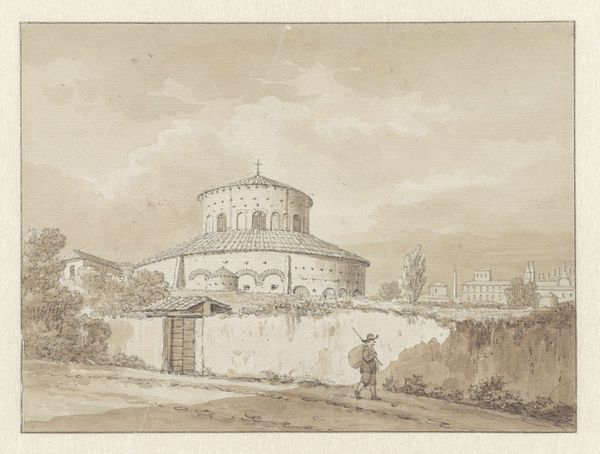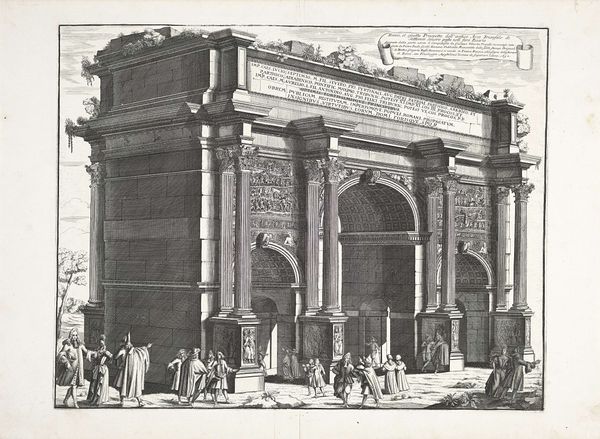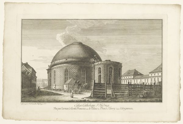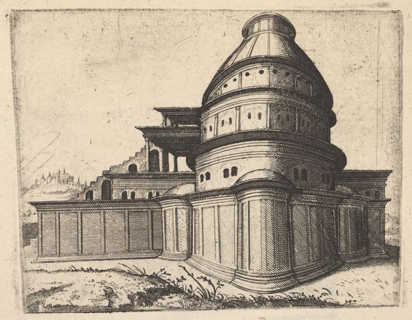 Editor: This is Giuseppe Barberis’s "Veduta Del Camposanto," an etching from 1897. It shows a series of neoclassical buildings, maybe a mausoleum or cemetery, and there’s this feeling of quiet solemnity, amplified by the print medium. What strikes you about it? Curator: I see a careful construction of power, wouldn't you agree? The crisp lines of the architecture speak to a desire for permanence, order, and control—ideals rooted in Neoclassicism. Consider, though, what that "order" meant historically: Often, it enforced hierarchies related to race, class, and gender. Does this aesthetic of idealized structure have a dark underbelly? Editor: That's a really interesting perspective, I hadn't considered the socio-political aspects. The clean lines seemed like just an artistic choice, evoking this timeless aesthetic. Curator: Exactly! It is both. Etchings, with their reproducibility, democratized art, but simultaneously served dominant ideologies by representing powerful architecture. Consider who gets to be memorialized like this, in such grandeur. Who is forgotten or erased? How might this space be contested or re-appropriated? Editor: So you're saying that this beautiful, seemingly neutral depiction of architecture actually reinforces existing power structures? Curator: It can function that way, yes. It's vital to interrogate these seemingly neutral images and unpack the cultural narratives they uphold or challenge. Neoclassicism, here, may appear simply as a revival of classic ideals, yet it's deeply entwined with societal power dynamics. Editor: I will never look at Neoclassical art the same way. Thinking about it as more than just an aesthetic is important, to consider who gets to have their story told and their existence recognized through art. Curator: Precisely! Seeing art as active within the historical landscape, is vital. It makes for more meaningful engagement.