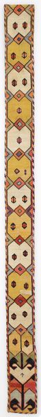 Curator: Here we have a textile piece, a kamarband dating from the late 19th century. Kamarbands are decorative belts or sashes. This one, whose creator remains anonymous, is currently housed here at the Minneapolis Institute of Art. Editor: My first impression is a feeling of rich cultural storytelling woven into the very fabric of this textile. It really draws you in with its meticulous geometry. Curator: Absolutely. Consider its role in reflecting the social and cultural identity of its time. It was most likely an adornment for someone of stature, as its woven patterns are quite elaborate. Editor: The repeated motif, almost like a stylized floral form, or perhaps even a paisley variant, immediately grabs my attention. What symbolic readings might we give to such recurring elements, especially given the Islamic art context? Curator: Indeed. The motifs likely held layers of symbolic meanings—prosperity, fertility, status. And the visual language has significance—a constant rhythm through repetition, speaking to societal ideals of harmony and order in the 19th century. Editor: I agree completely. The colors, too, aren't just decorative choices. Deep reds might indicate passion, the softer yellows perhaps intellect or wisdom. Colors can have specific meanings related to cultural stories and social hierarchies. Curator: It is hard to truly know exactly the intention of the artisan of course, but examining such textiles provides insight into artistic skill and technological capabilities during that period, and into how those shaped broader cultural practices and aesthetic tastes. Editor: Considering it would have adorned the body, how the kamarband moved, how it caught the light – even that small bit of performance carries emotional meaning in its own time. It really makes it such a vivid, resonant artifact. Curator: By understanding art as both an expression of personal style and as a marker of larger historical trends, it brings historical art to life in new ways. Editor: For me it bridges a gap through pattern and textile and connects across time with what might be considered timeless imagery.