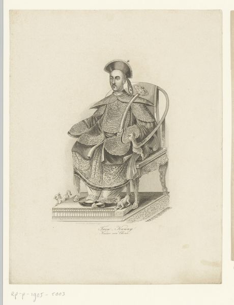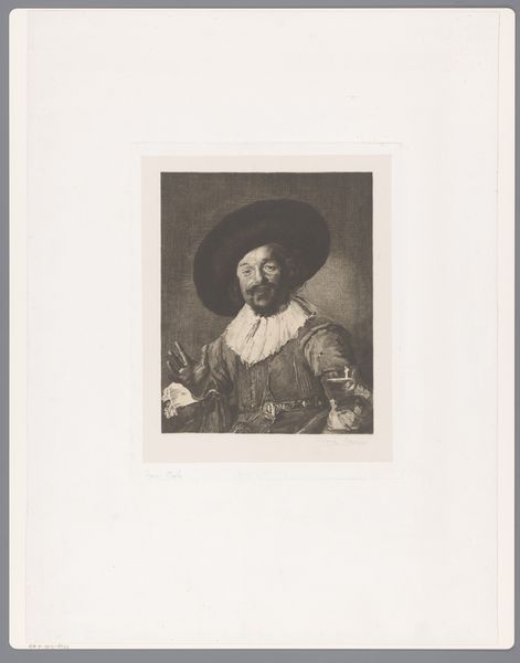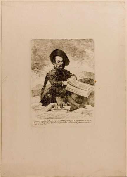Editor: We're looking at "A Dwarf" by Francisco de Goya, created in 1778. It’s an etching printed on paper and currently residing at The Art Institute of Chicago. It’s a somewhat melancholic portrait, isn't it? How do you interpret this work, focusing on its artistic merits? Curator: Let's examine the linear structure of the etching. Goya masterfully uses hatching and cross-hatching to model the figure, achieving a remarkable tonal range within the monochromatic palette. Observe the contrasting textures; the rough, almost chaotic rendering of the landscape against the more refined detail of the dwarf's costume. Do you notice how the composition leads the eye? Editor: I see what you mean. The subject is central but his gaze almost deflects to the side, and my eyes wander with his. What are your thoughts on the positioning of elements and Goya's use of light? Curator: Indeed. The diagonal placement of the book, the subject's legs, and his hat directs the viewer's gaze. Goya's manipulation of light is superb. He casts shadows strategically to define the planes of the face, giving it depth and personality. Also, there are interesting relationships formed from shape repetitions. Note the curve of the hat's brim, mirrored by the shape of the open book, unifying the image and giving it balance, though the pose is asymmetrical. It generates visual rhythm within a static composition. What do you observe regarding negative space? Editor: Well, the emptiness surrounding the figure creates a kind of isolation. The subject doesn’t quite engage with the scene around them. This seems more to be about internal contemplation rather than existing within a busy scene. Curator: Precisely. The artist used emptiness deliberately to enhance the figure's presence, compelling viewers to consider their own perspectives on marginality and representation. A technical accomplishment for its time. Editor: I never noticed the hat's brim shape, but it definitely impacts the reading of this work as a considered arrangement and now has become an obvious contribution! Curator: Such considerations allow for richer interpretations through visual literacy, something the artist knew all too well.